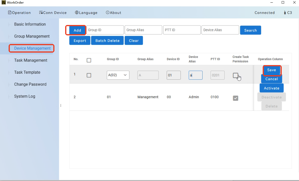 5. In the "Device Management" section, click "Add". Select the Group ID, fill in the PTT ID and Group Alias. If this device needs to be set as the supervisor for the group, check the "Create Task Permission" box. After configuration, click "Save and Activate".