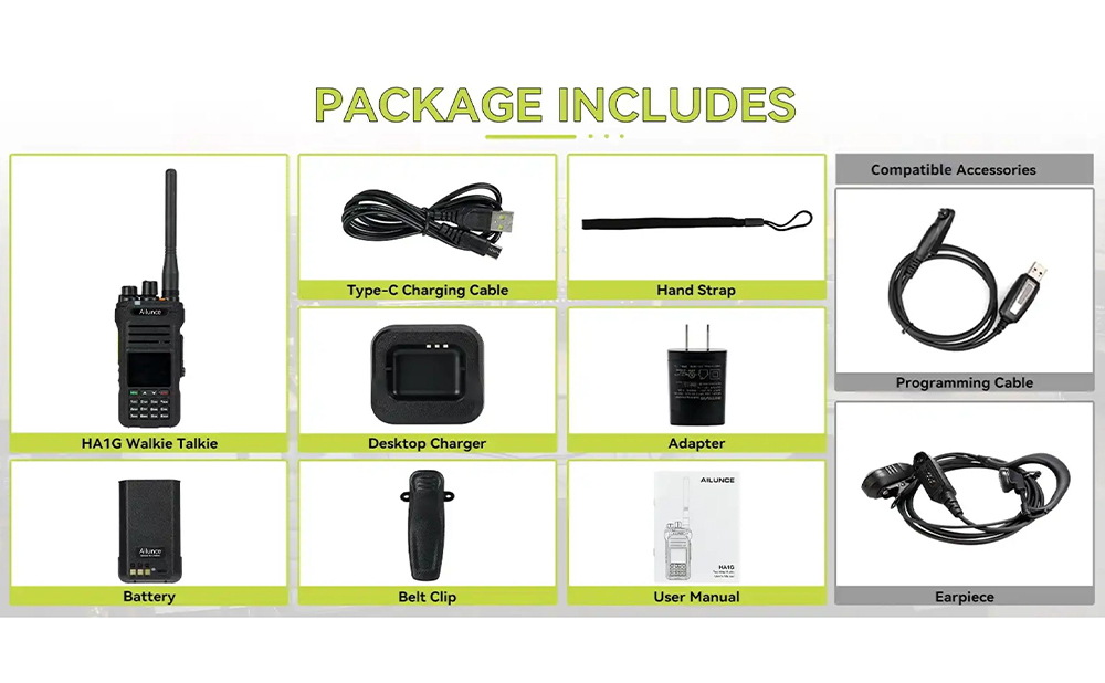 Ailunce HA1G GMRS handheld radio Comes with a standard type-C charging port and a USB charging base, so it is convenient for you to use a power bank or charge the radio or the battery directly in the car.