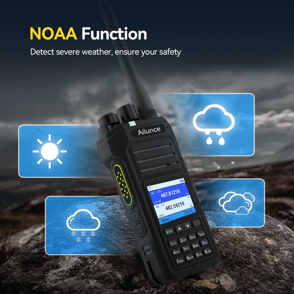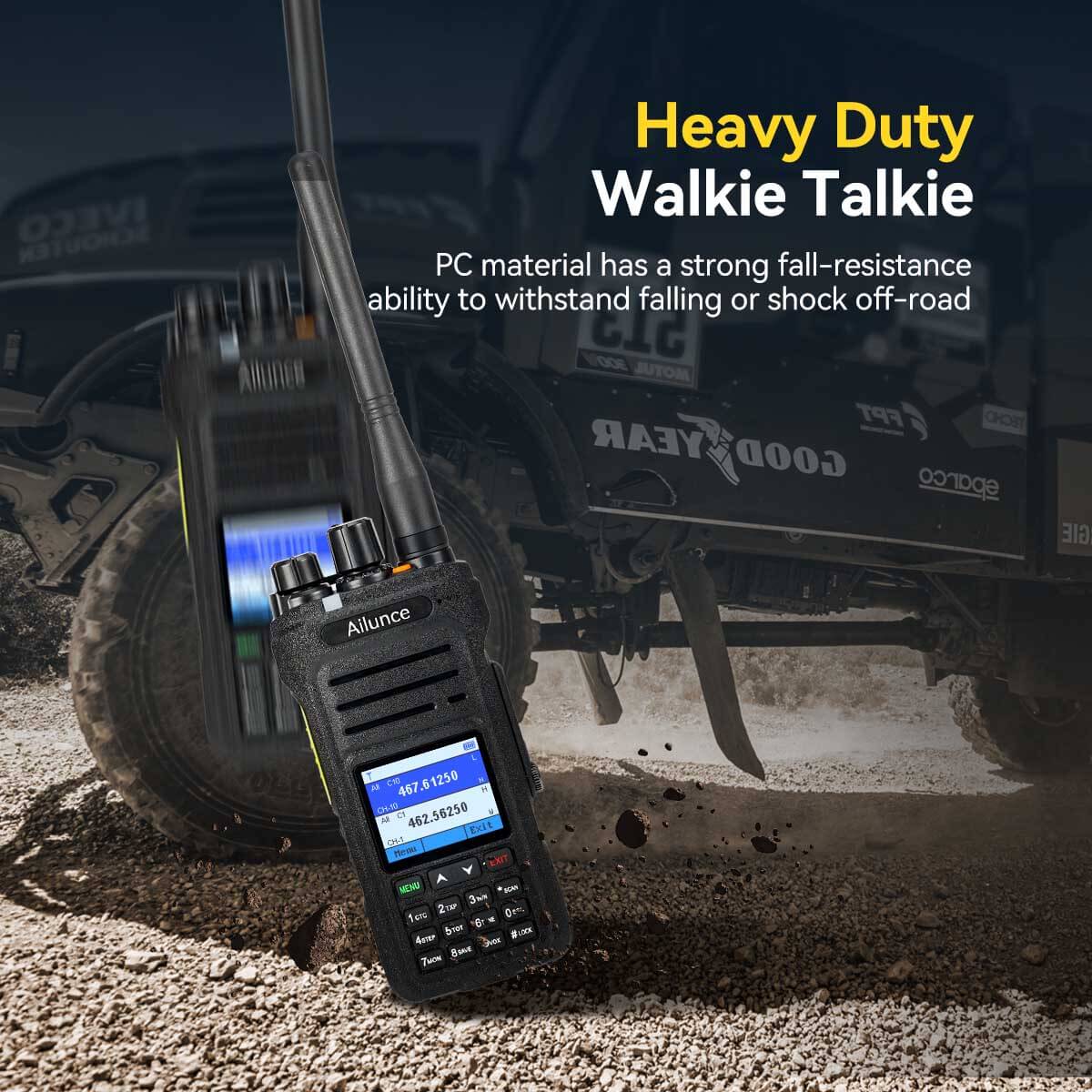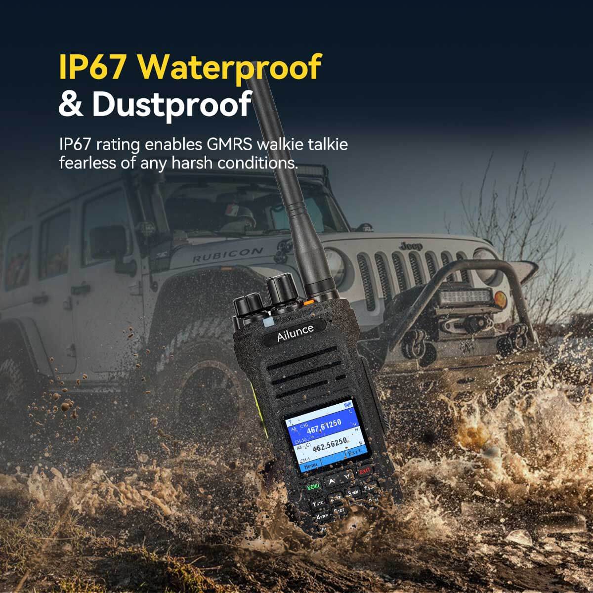 Retevis Ailunce HA1G is a durable IP67 waterproof GMRS two-way radio with 30 GMRS channels, 220 customizable channels, and NOAA weather alerts. Stay connected in any weather condition with this reliable communication device. Suitable for outdoor camping, team exploration, emergency rescue, etc.
