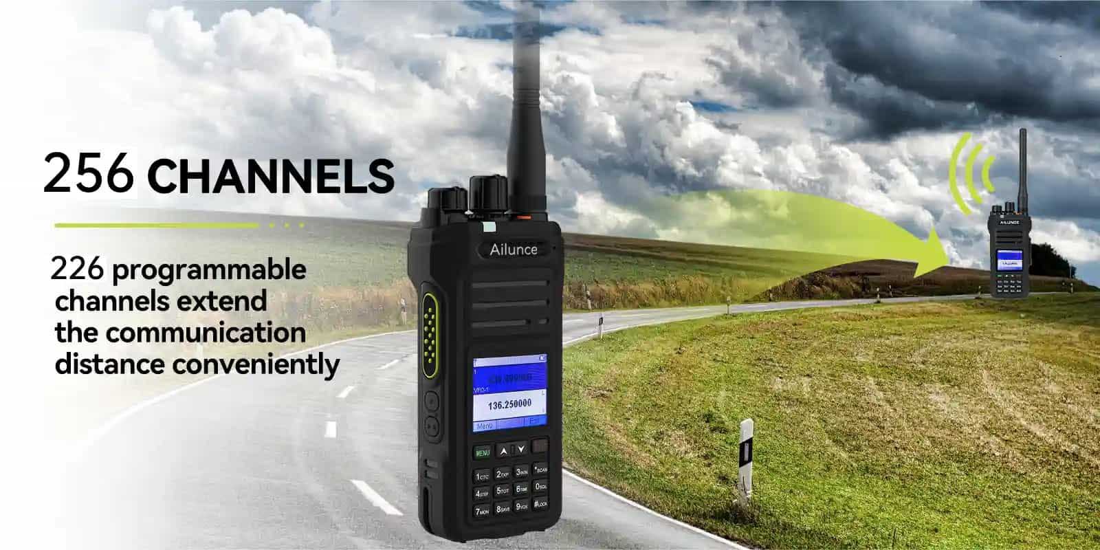Ailunce HA1G has 256 memory channels, including 30 GMRS channels + 226 custom channels, it can communicate with other radios out of the box, you can easily add new channels and change settings at any time through PC and keyboard menu program