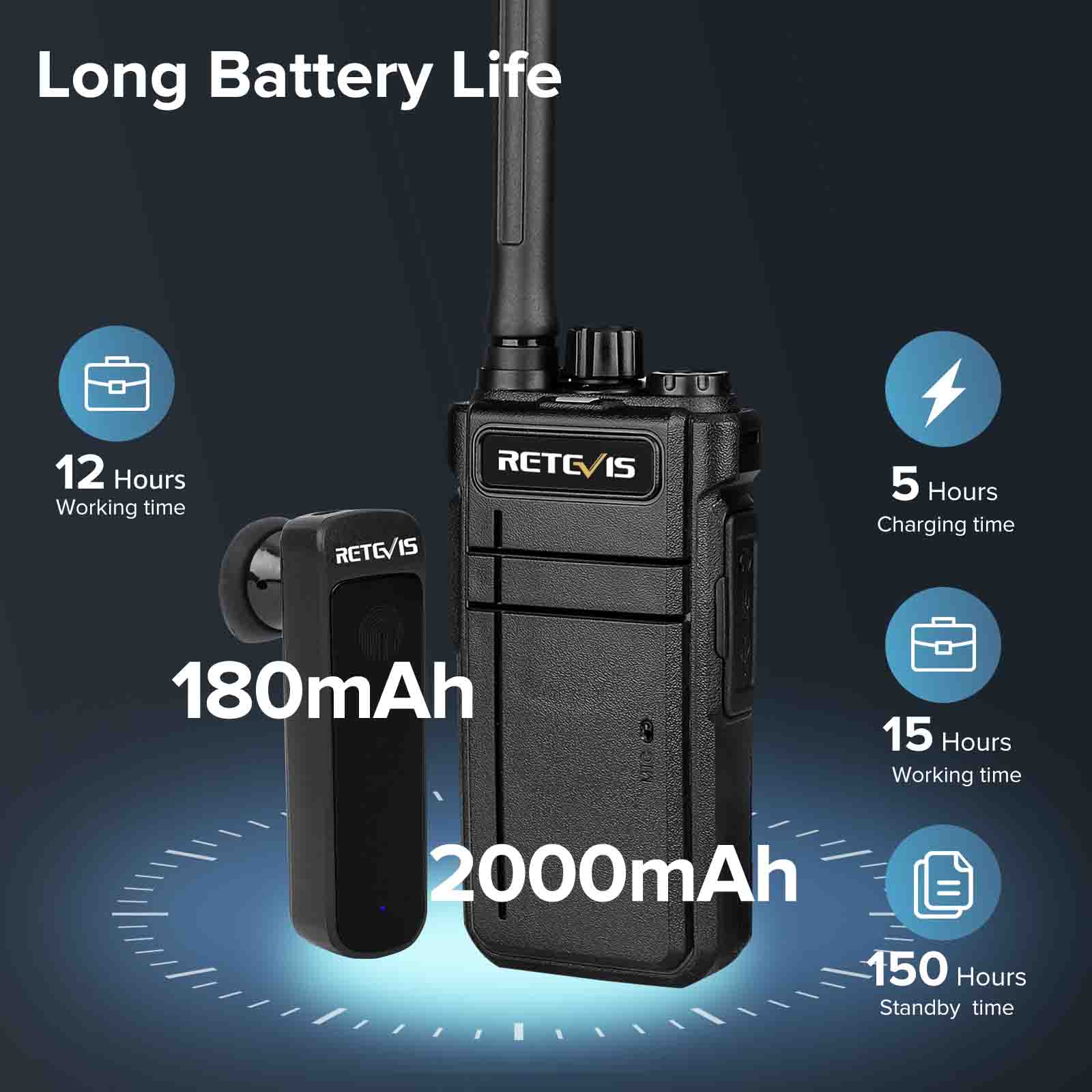 Retevis RB37 Bluetooth FRS two way radio is a great device for staying in touch with customers, colleagues, and employees. The radio is powered by a 2000mAh rechargeable battery, which can provide more than 15 hours of continuous use.