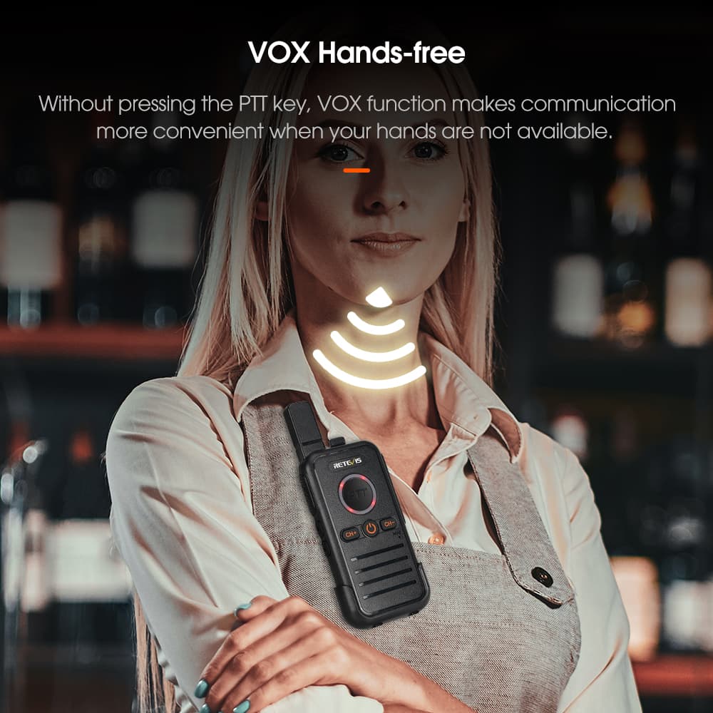 With VOX (Voice-Activated Transmit) function, you can keep your hands free when talking to the walkie talkie without pressing the PTT button.