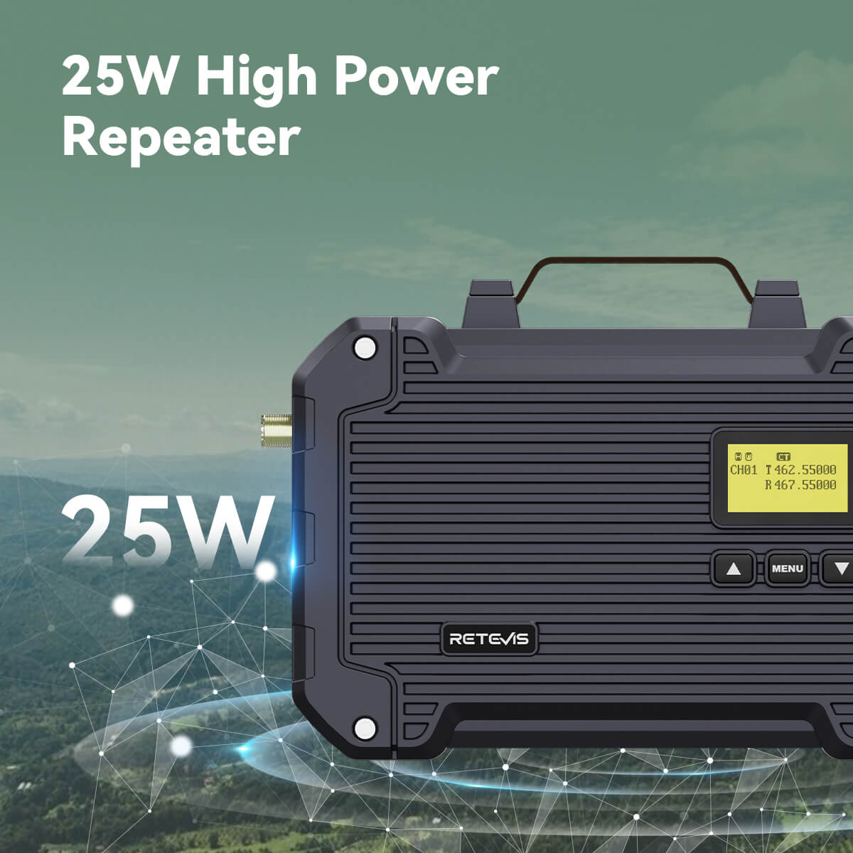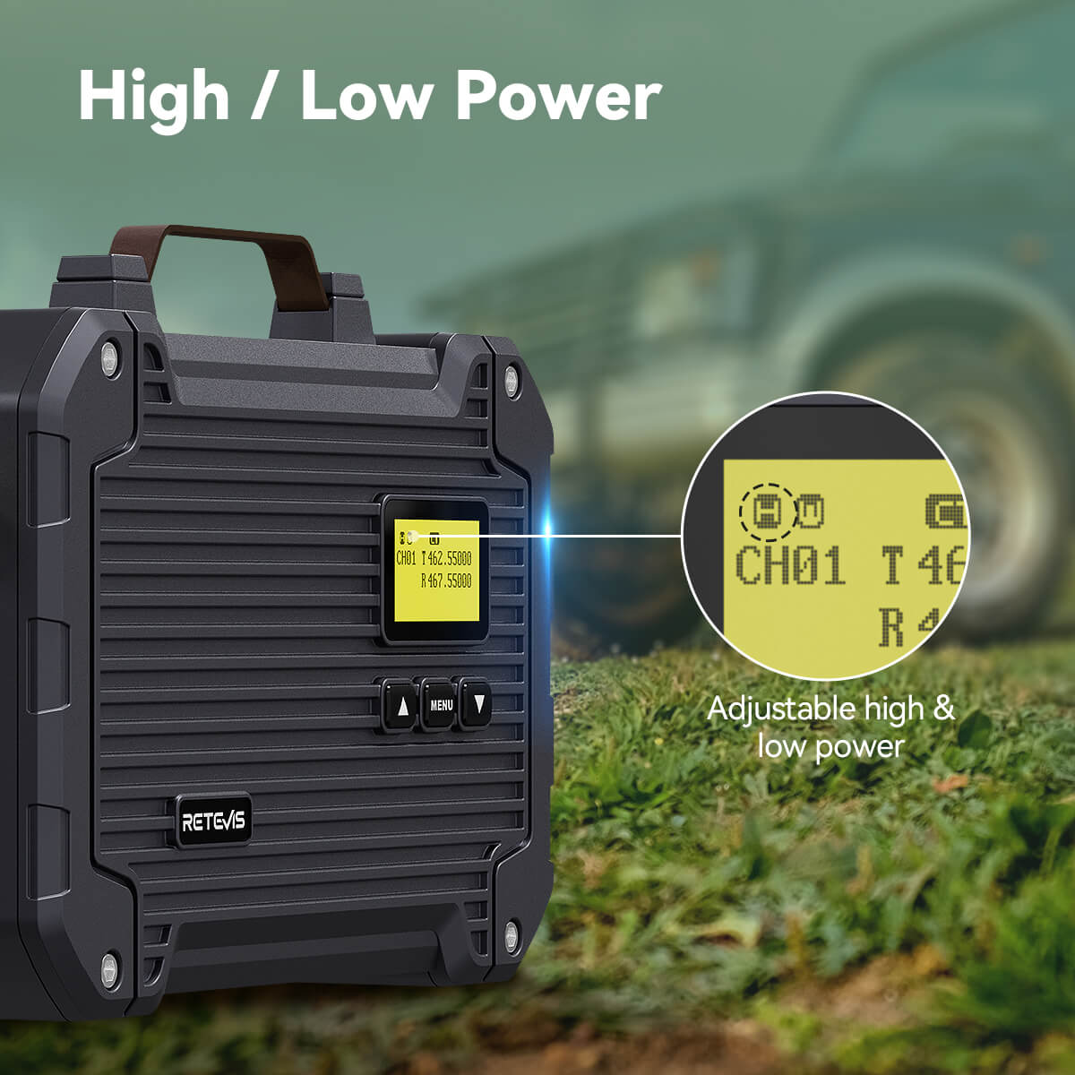 The RT97L operates at 25W output power, dramatically extending the range of your RB48 Pro handhelds. Switchable low power mode provides energy efficiency when full power isn't required. This powerful transmission capability ensures signals penetrate deep into large facilities and across vast outdoor areas.