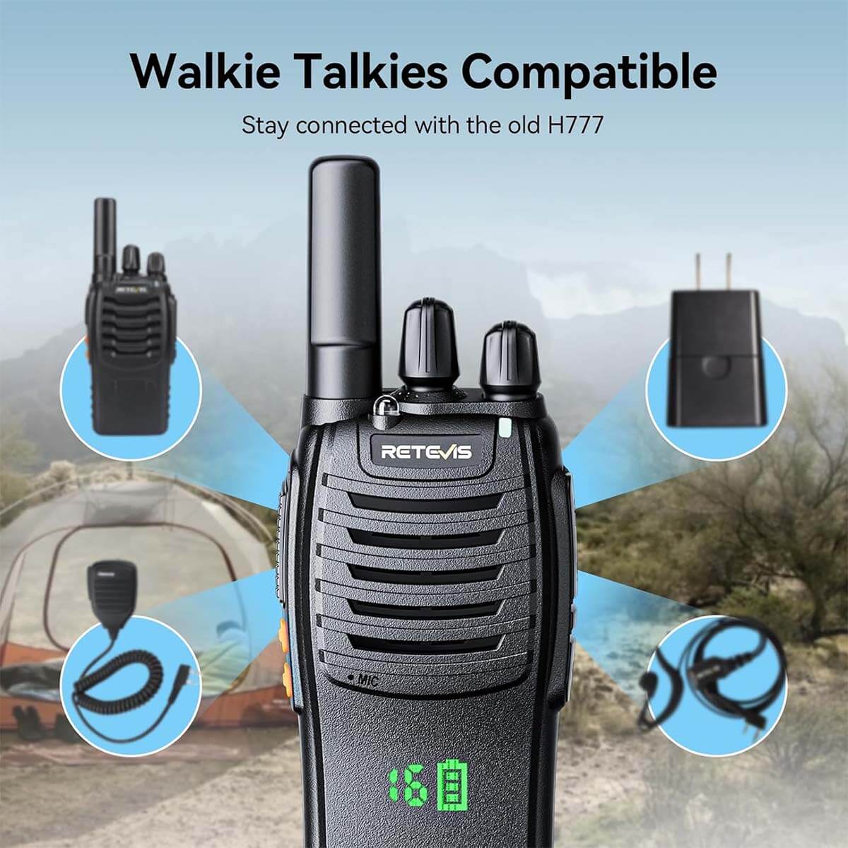 H777H FRS walkie talkies can work with the H777 FRS radios and are compatible with H777's accessories such as earpieces, speaker microphones and six-way chargers, increasing the flexibility of use.