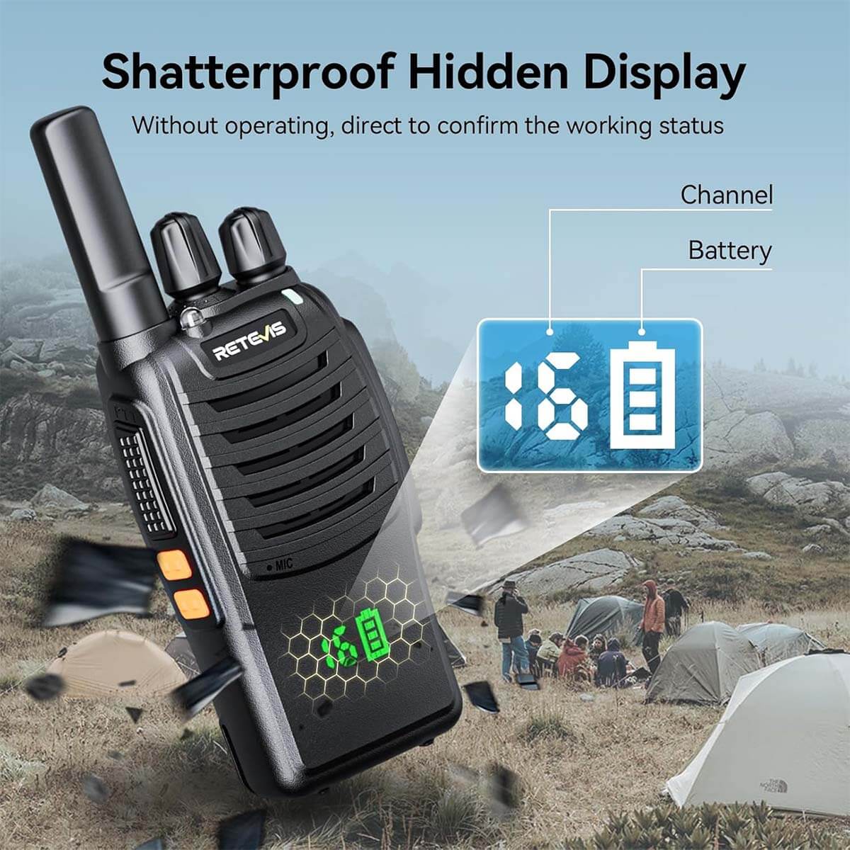 H777H Two-way radio adopts a hidden display screen, which is more shatterproof, and you don't have to worry about easy breakage. In addition, battery and channel information are clear and easy to read.