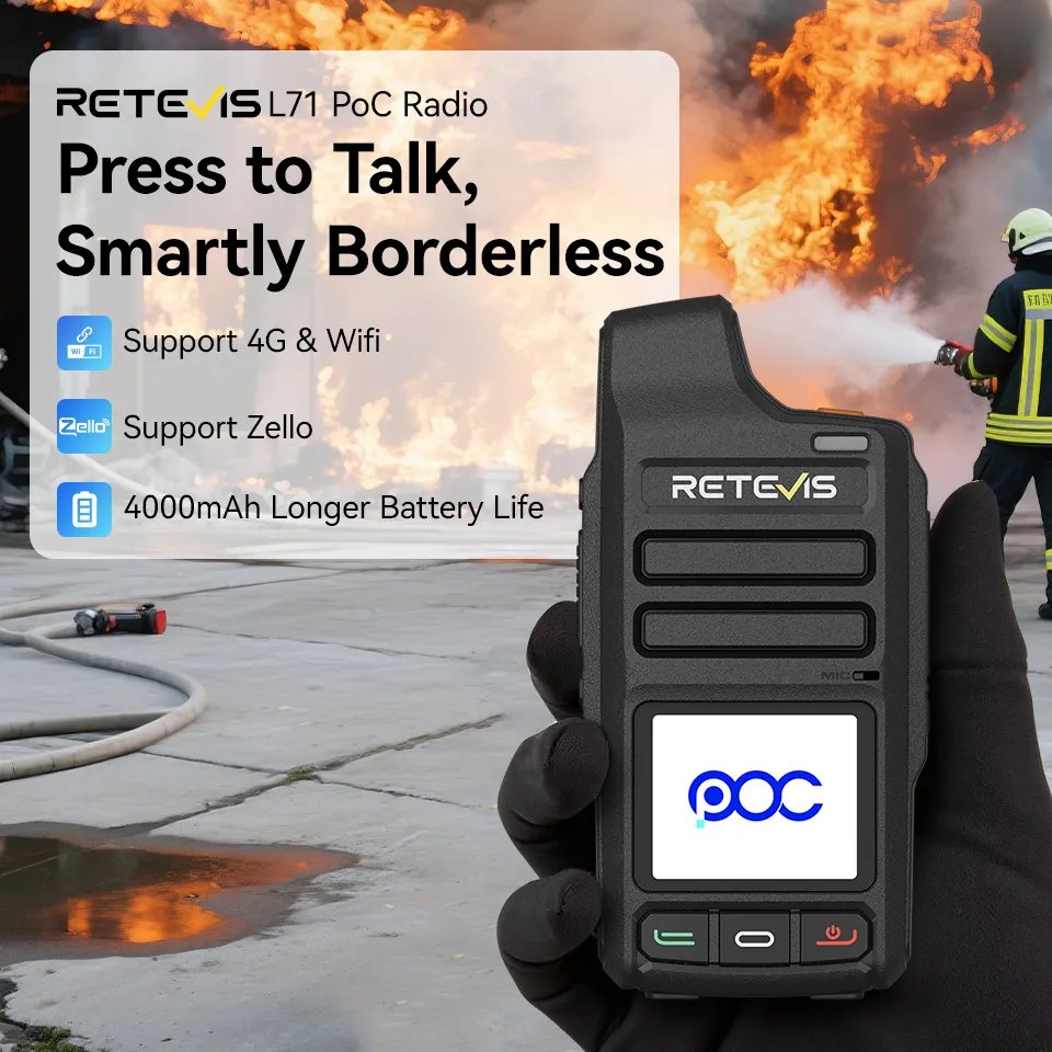 Retevis L71 POC Radio is built for the unexpected: 4G POC communication, dual SIM reliability, and ZELLO compatibility keep teams connected nationwide. Durable design, GPS tracking, and SOS alerts protect workers in harsh conditions, while fast charging and a color screen streamline operations. Trusted by emergency services, logistics fleets, and construction crews worldwide.