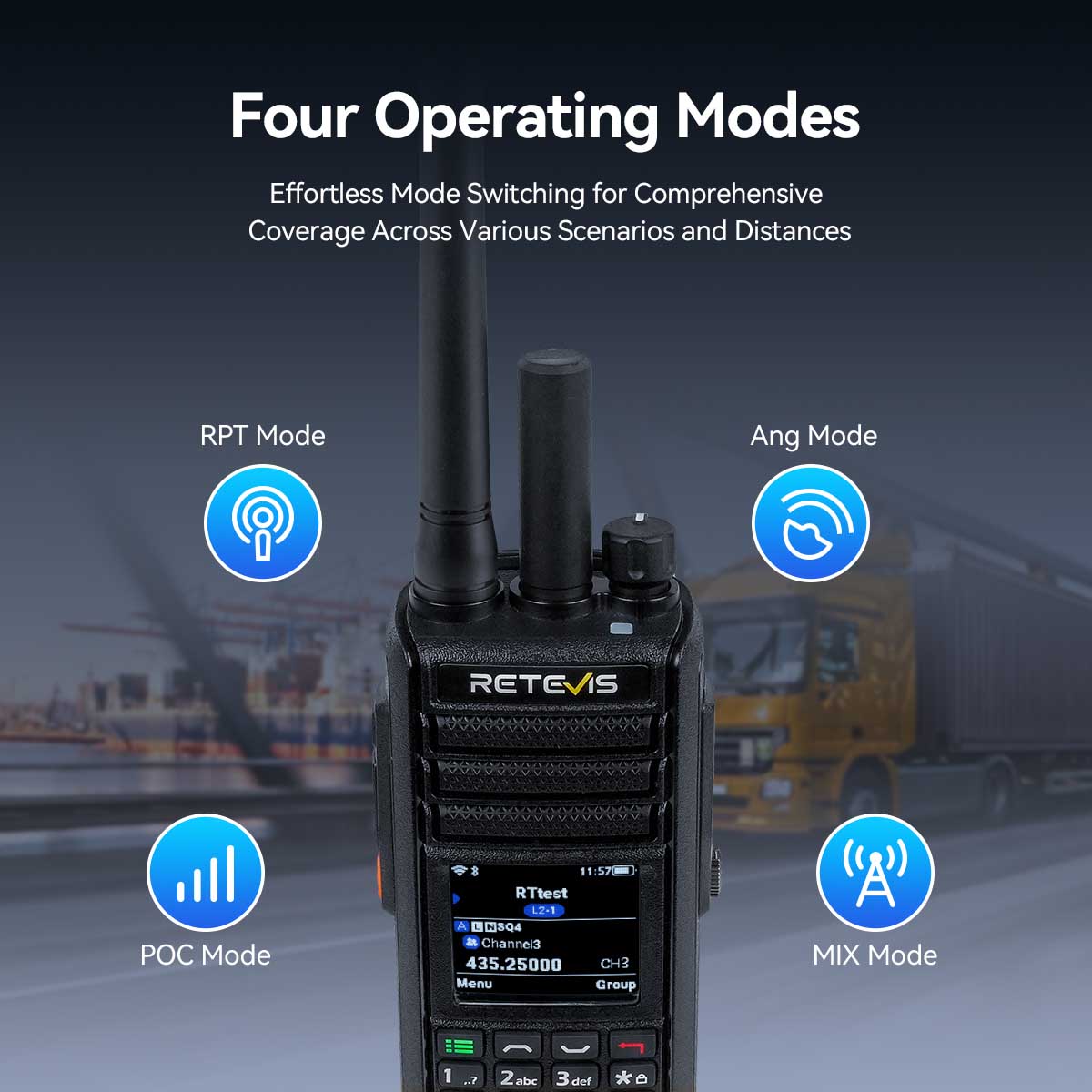 Adapt to any situation with the Retevis Mate Talk L2. This global walkie talkie with GPS tracker offers four working modes—Analog, PoC, MIX, and RPT—to ensure reliable long-range communication. Whether you need secure private calls, cross-regional collaboration, or extended coverage up to 1000 miles, the dual-mode capability gives you the right communication solution for every task.