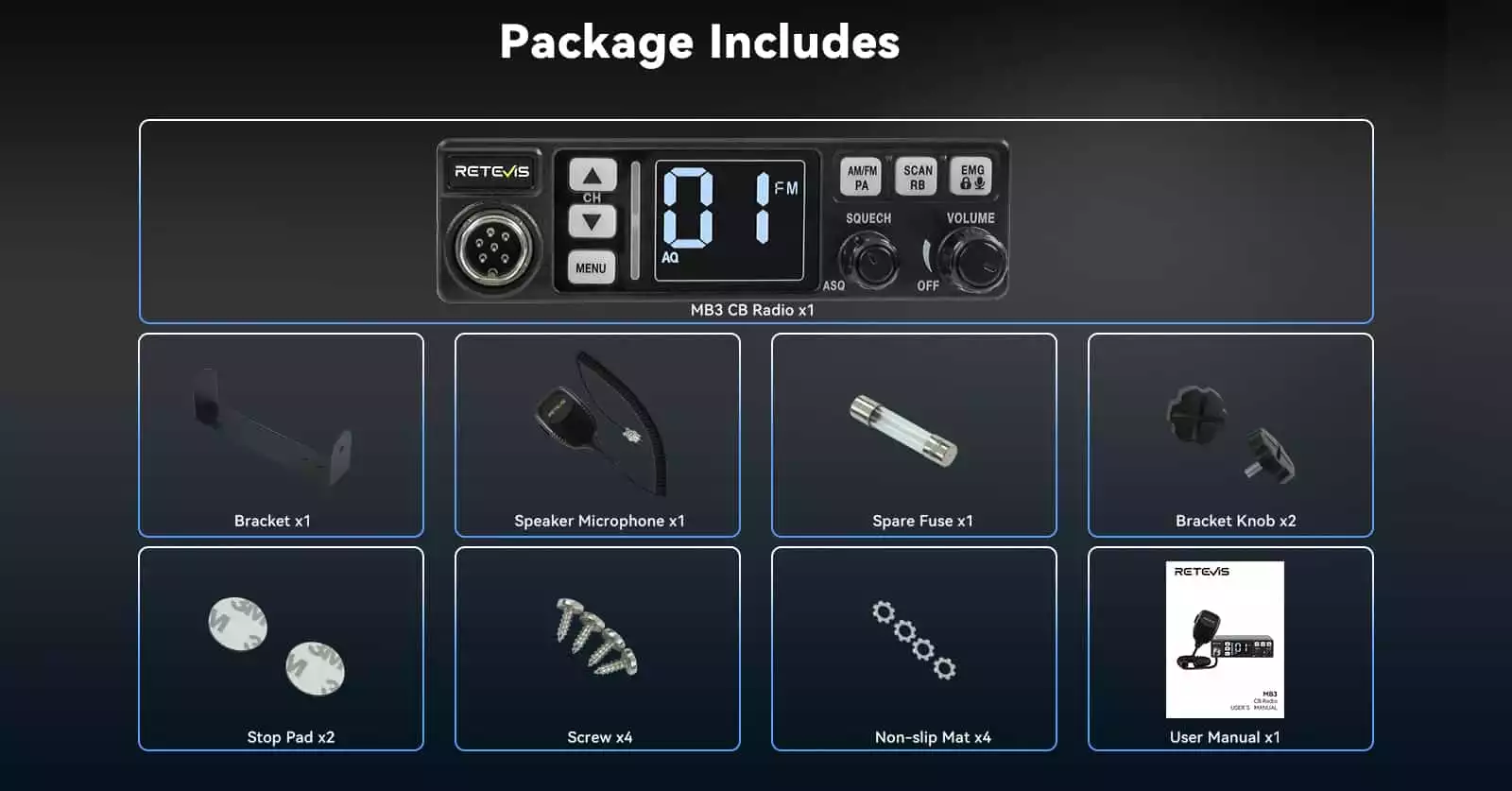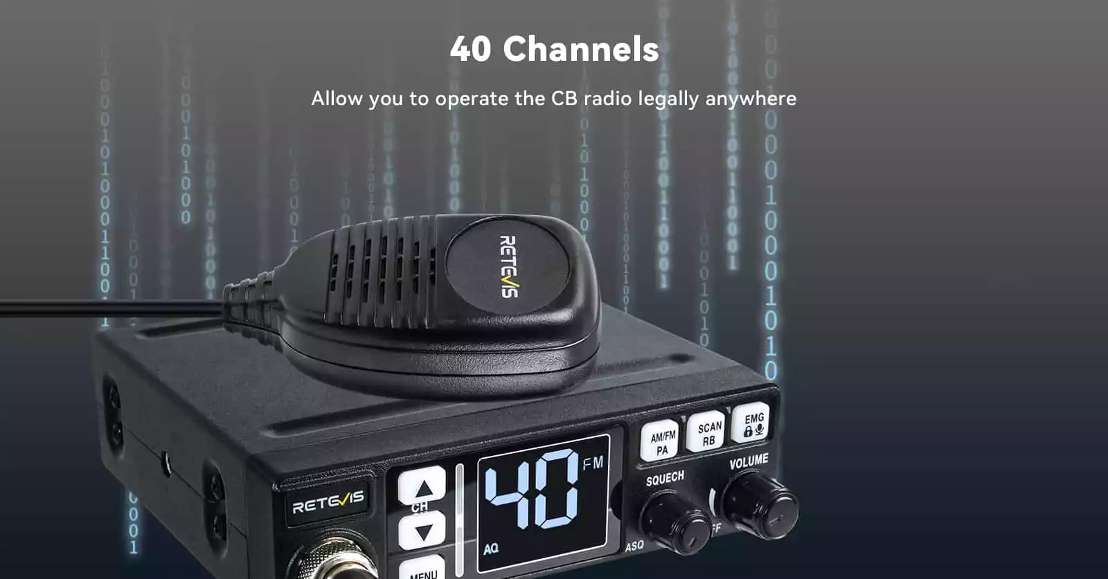 Enjoy the complete range of 40 CB radio channels to communicate with those around you. Keep in touch with others on the road, and stay tuned in to emergencies and traffic situations. This Retevis MB3 CB radio is easy to install in your truck or car, and easy to use as well, so you can have conversations in no time.