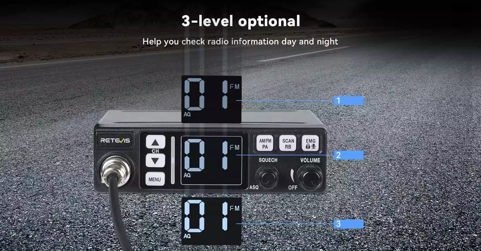 With a black backlit LCD display and a 3-level optional, this Retevis MB3 CB radio is optimized for day or night viewing, viewing the current channel, the volume, and other features on the display.