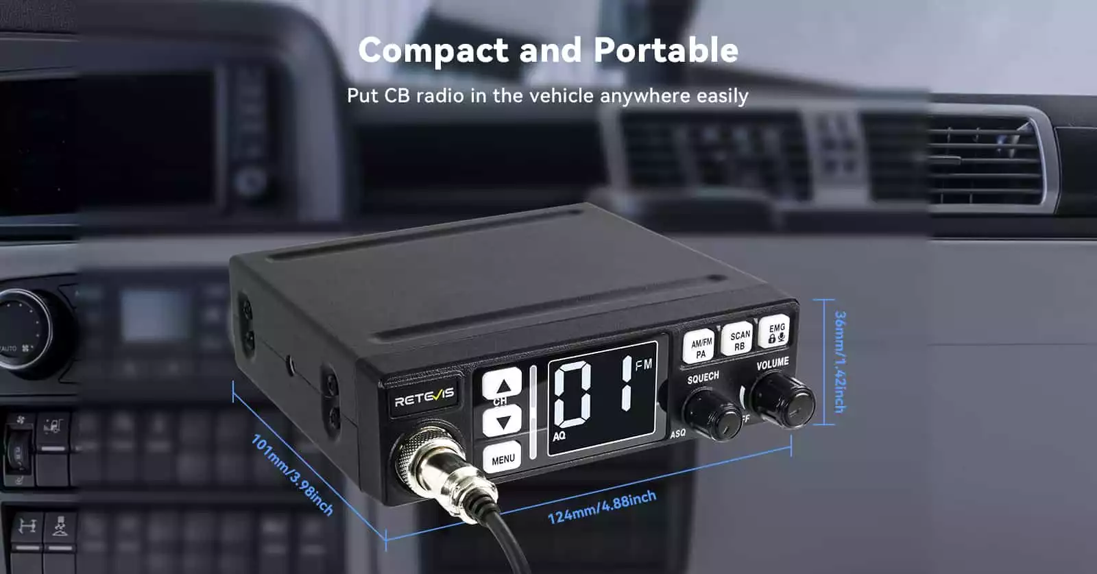 The size of the Retevis MB3 CB radio is 4.88*3.98*1.42 inches and the weight is 1.04Ib. A portable CB radio is easy to put anywhere in the vehicle. No need to take up much space.