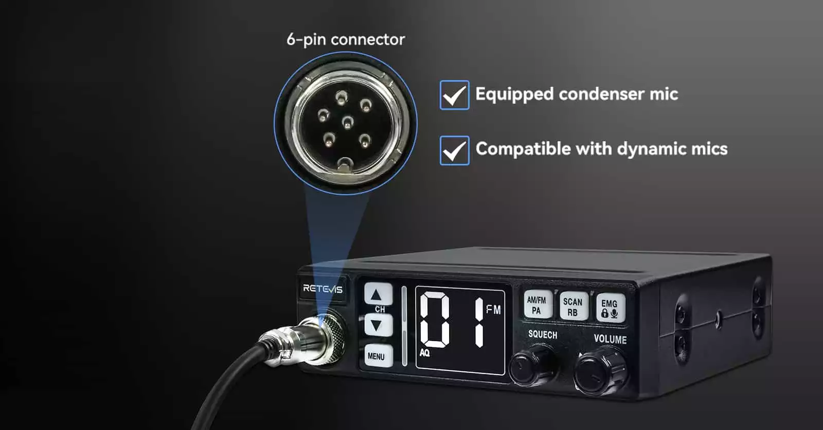 The Retevis MB3 CB radio kit features strong compatibility with its 6-pin connector, enabling seamless connection of both the included condenser mic and a dynamic mic for easy transmission and reception.