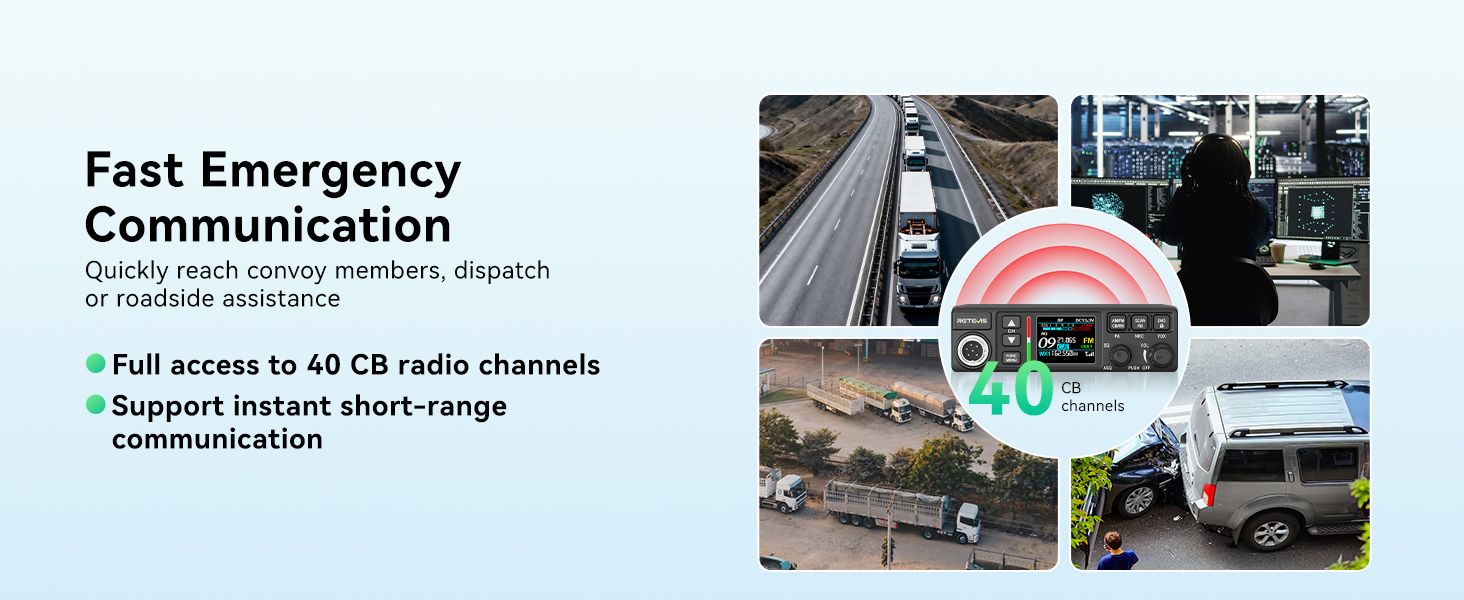 Safety is always the top priority on the road. Retevis MB3B provides full access to 40 standard CB channels and supports instant short-range communication. In the event of an emergency or a need for road assistance, you can quickly reach convoy members, dispatch centers, or roadside services, ensuring 24/7 safety and security.