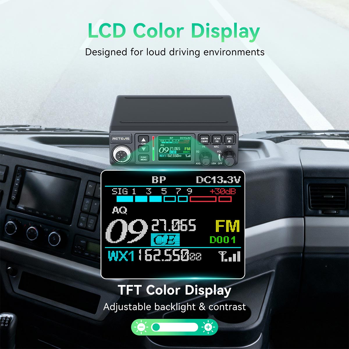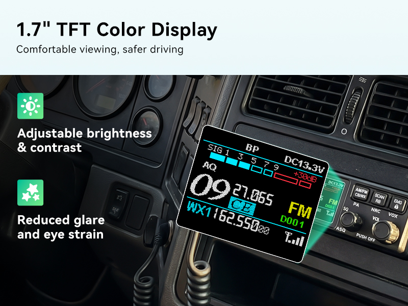 The MB3B is equipped with a 1.7-inch TFT color display that supports brightness and contrast adjustments. Whether in glaring sunlight, dim tunnels, or night driving, the clear icons and stable visibility significantly reduce eye strain. Drivers can quickly access channel information without distraction, ensuring a safer driving experience.