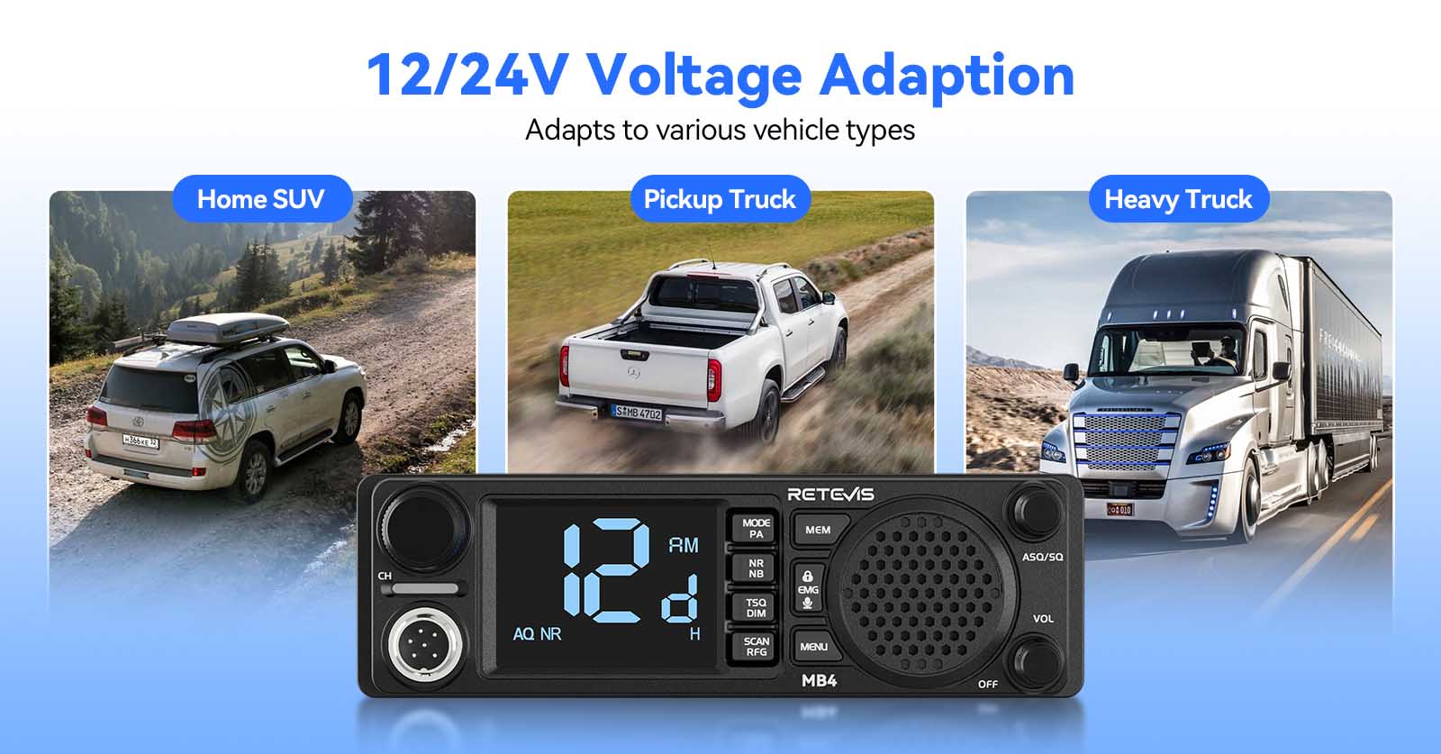 Stay connected no matter your ride with this MB4 CB radio, designed to automatically detect and adapt to both 12V and 24V vehicle systems. Whether you're driving a truck, SUV, or any other vehicle, enjoy stable, interference-free performance—even during ignition. The compact design ensures seamless integration with your vehicle, providing crystal-clear communication for both commercial and personal use. Perfect for any driver, this DIN-sized compact CB radio guarantees reliable connectivity, so you’ll never miss an important call on the road, no matter where you are.