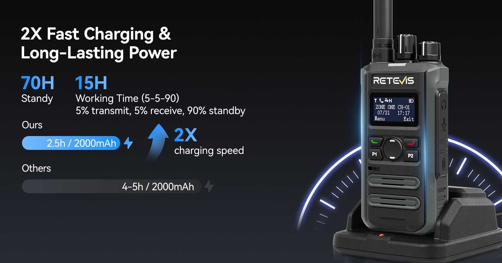 150 minutes fast charging; the high power walkie talkies with 150-minute fast charging keep security teams operational from setup to teardown; a 2000mAh battery ensures endurance of 15 hours; Type-C compatibility means quick power-ups
