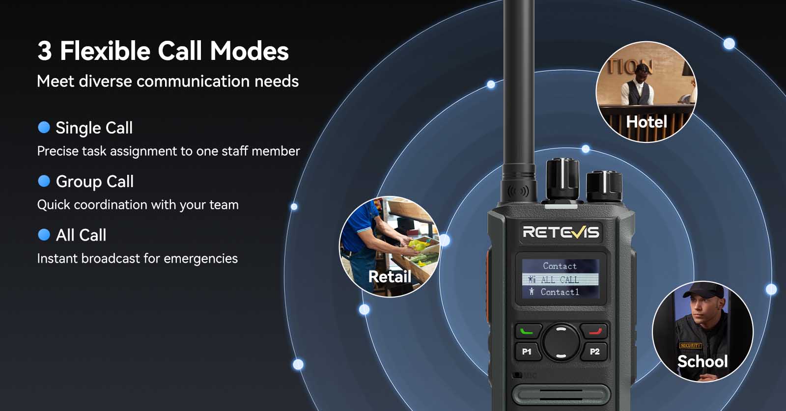 The commercial 2 way radio with flexible calling modes; use single call to assign tasks to associates; group call for department updates; and all-call for emergencies; reduce radio traffic and ensure critical messages reach the right people