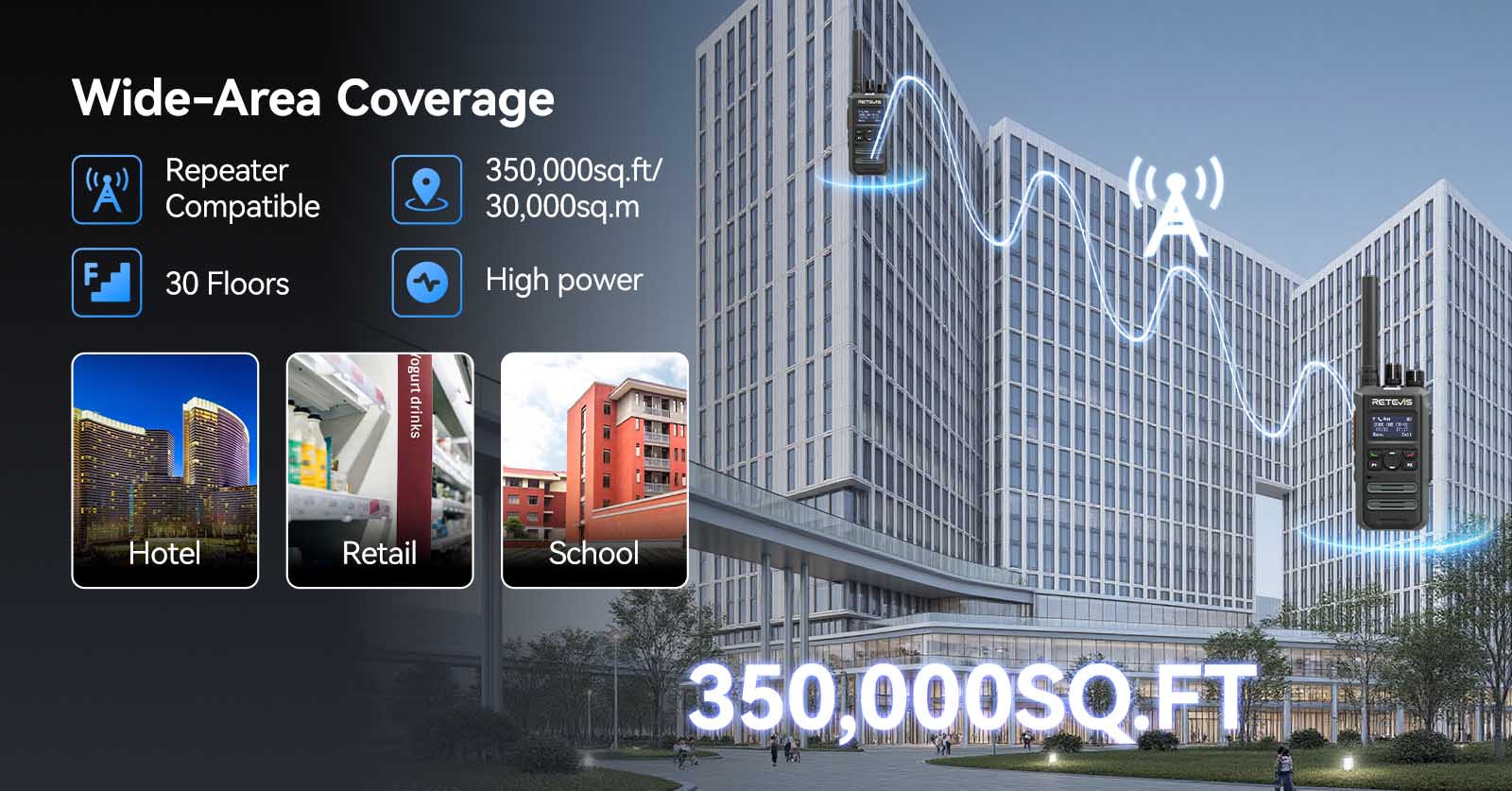 The high power walkie talkies deliver clear calls across 30,000sq.m/350,000sq.ft; even in hotel basement levels or loading place; with repeater compatibility; logistics teams coordinate deliveries and stock moves without signal drops