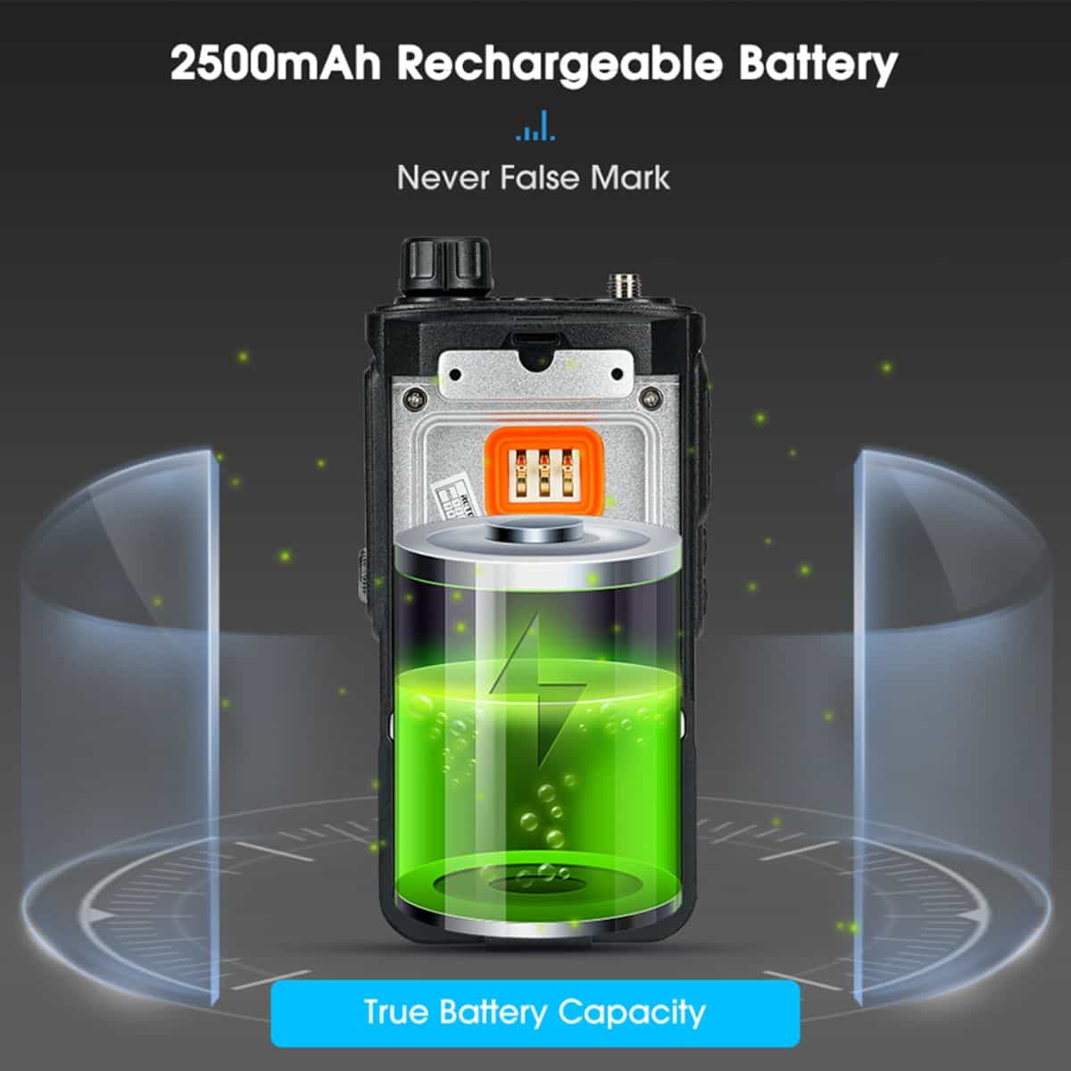 The RA89 walkie-talkie is equipped with a 2500 mAh lithium battery and can work continuously for 15 hours. The large-capacity battery is designed to help personnel who need to work in shifts in harsh environments maintain long-term communication.