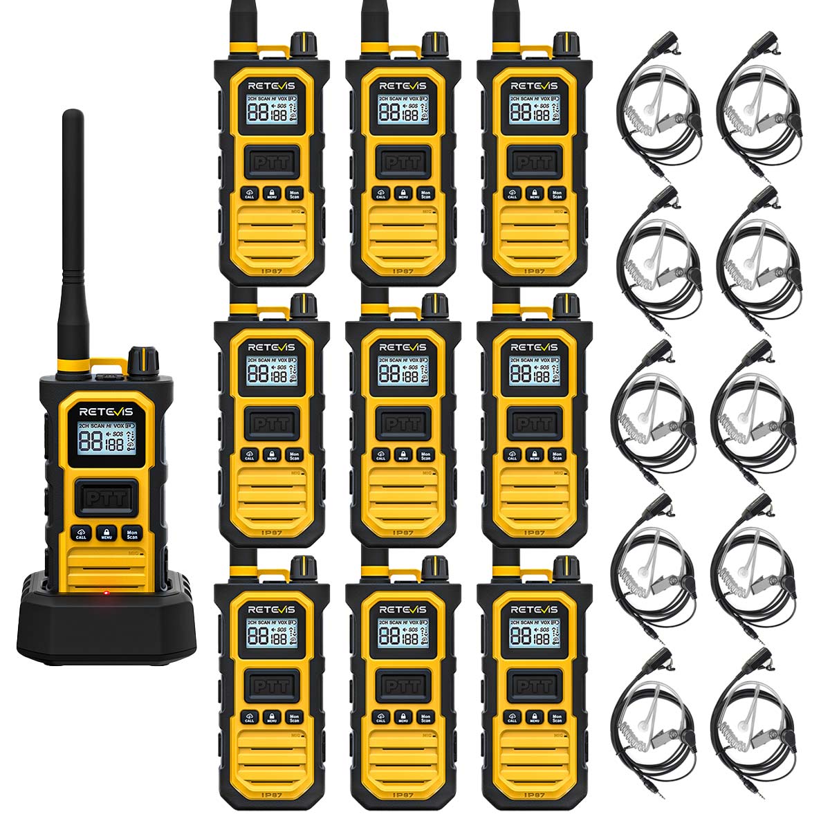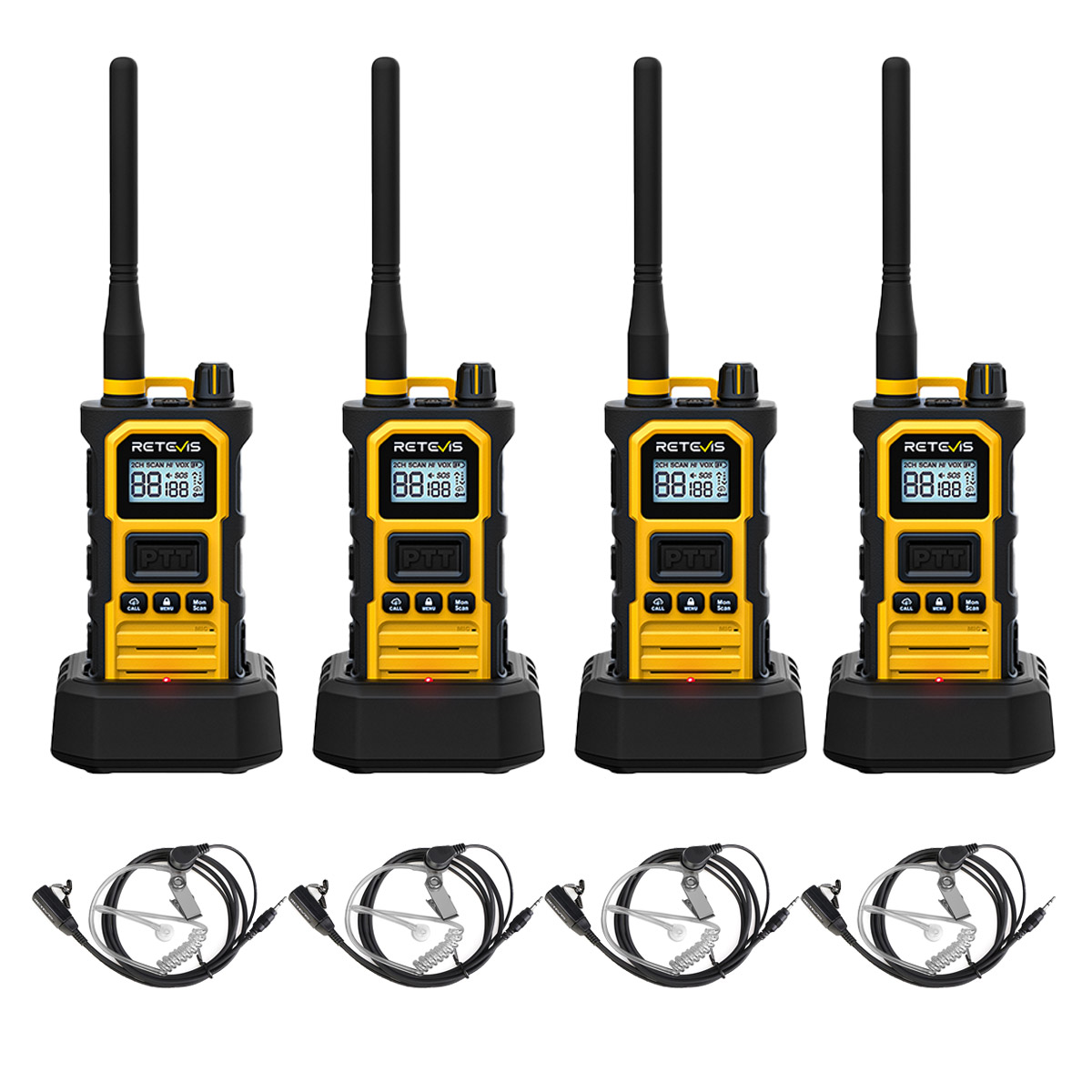 This is a review of Retevis RB48 Pro Heavy Duty Walkie Talkies With Earpiece, Long Range High Power Two Way Radios, AI Noise Reduction,IP67 Waterproof,2800mAh Battery,Group Call, for Construction Job Site (4 Pack) Yellow. This is a complete set of four walkie-talkies. To be precise, there are four complete sets. Each walkie-talkie is individually packaged an antenna, extensive accessories, charging cords, and more. They were partially charged and very easy to turn on and test out. The most impressive thing about these is the range: we were able to get two walkies 1/2 mile away from each other and still hear each other fairly clearly when outdoors. Inside a suburban home, there was much more static. But for camping, outdoor events, or anytime you're in short range when cell phone signals are weak, these are a great option.