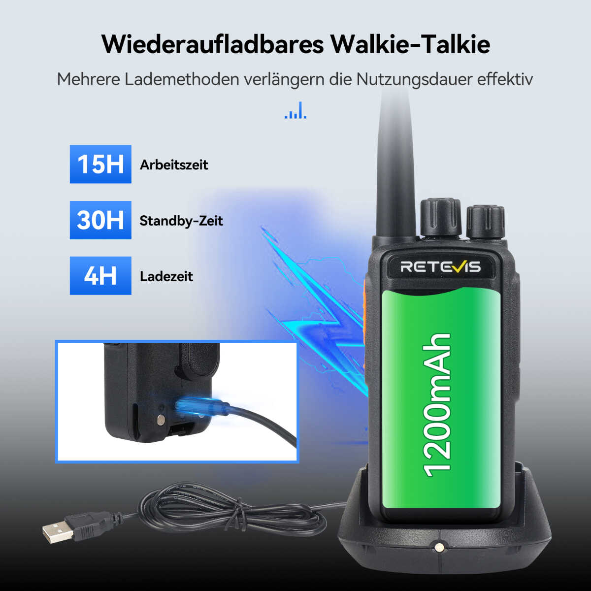 Each radio comes with a 1200mAh rechargeable Li-ion battery and a charging dock. It lasts around 15 hours and stands by 30 hours on a single charge depending on how much you transmit.