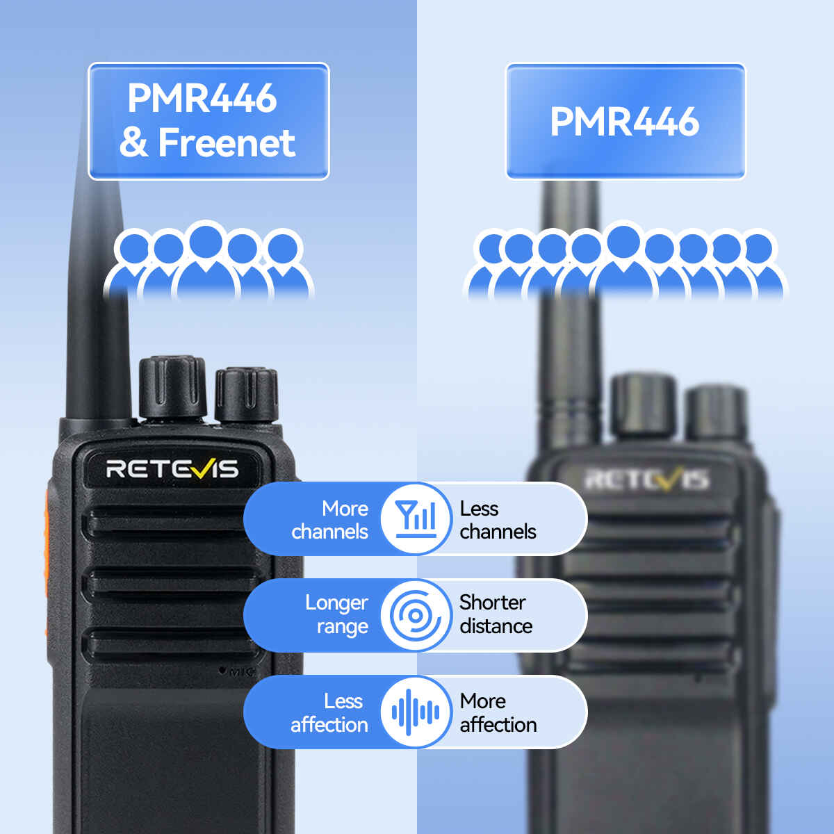 Retevis RB669 walkie talkies combine the two frequency ranges Freenet (149 MHz) and PMR446 (446 MHz). Long press the side key can switch between two bands. Whether in a built-up town or city environment or outdoor environment where line of sight or open terrain, RB669 can meet your communication needs.
