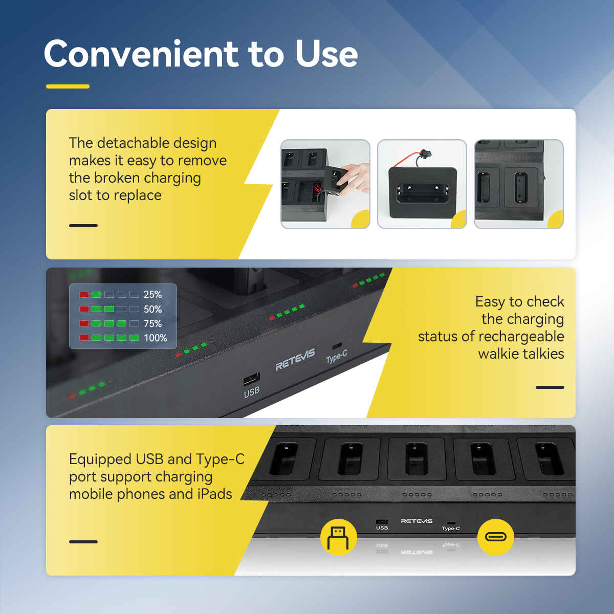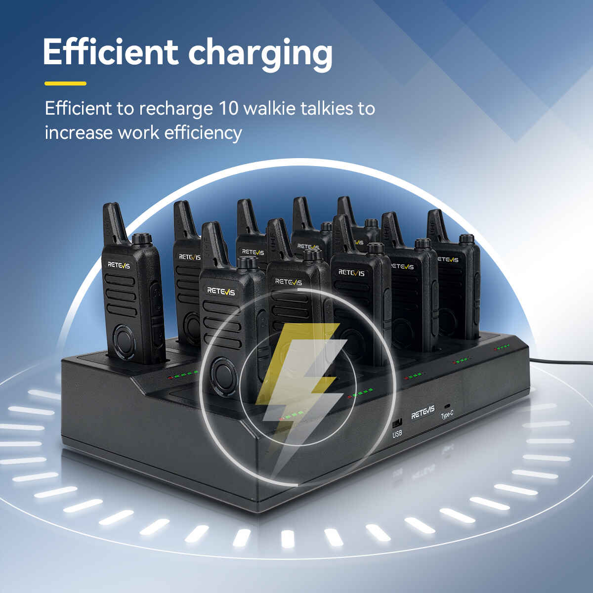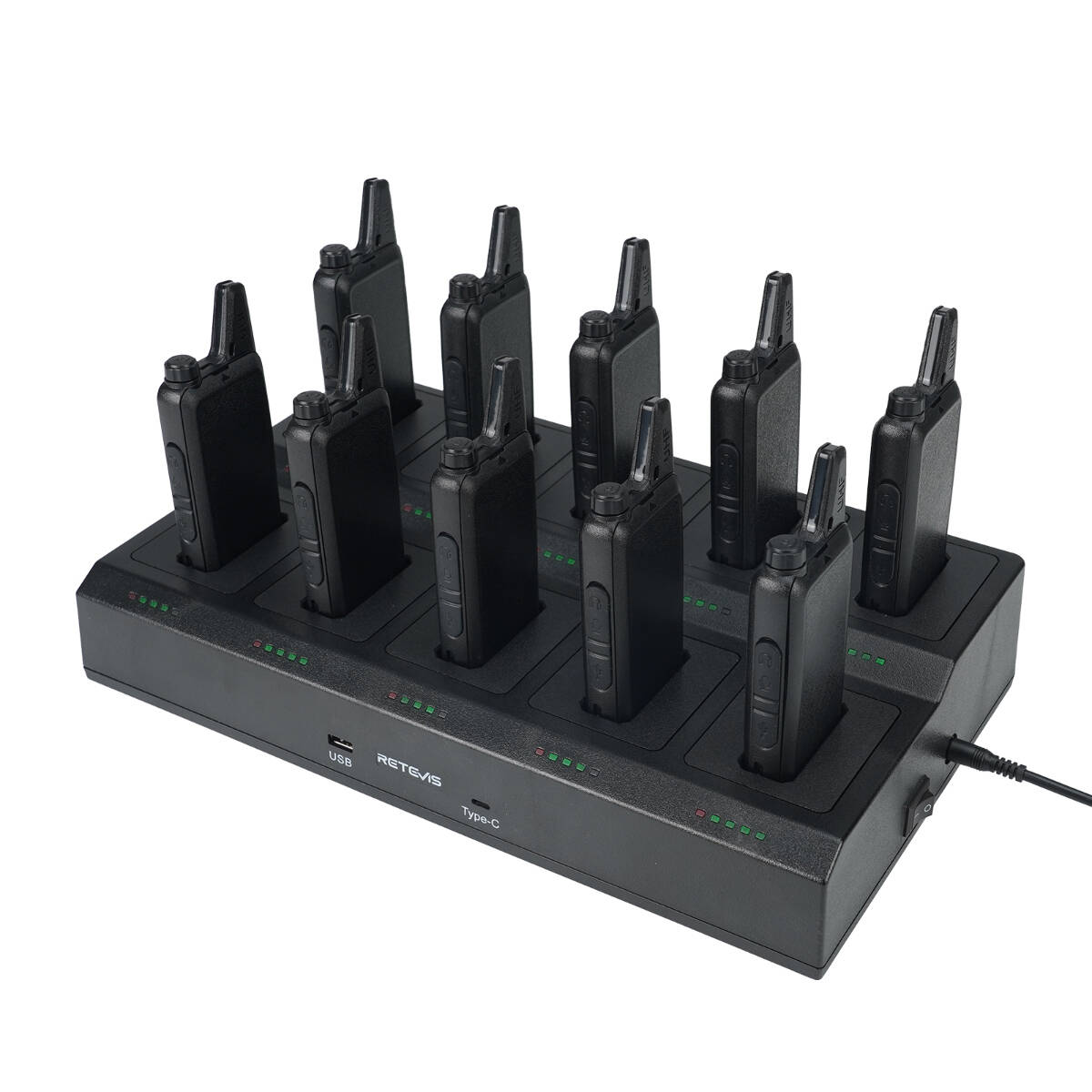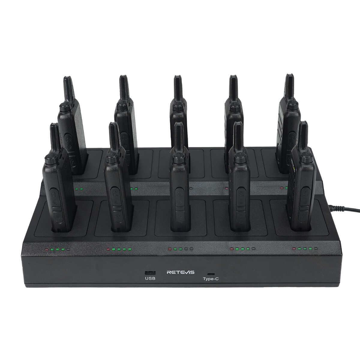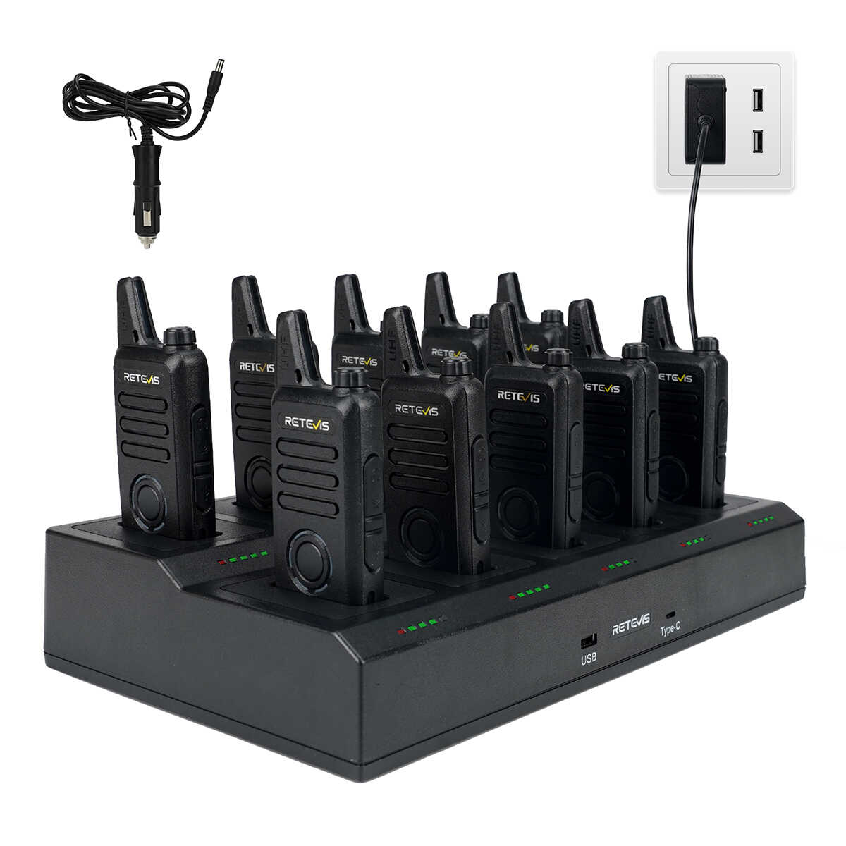 This set comes with 2 ten-way chargers that can charge 20 RT22S walkie talkies simultaneously, which is very suitable and efficient for your employees. The 10-way chargers support AC and DC power supplies. It is convenient to recharge two way radios indoors and outdoors.