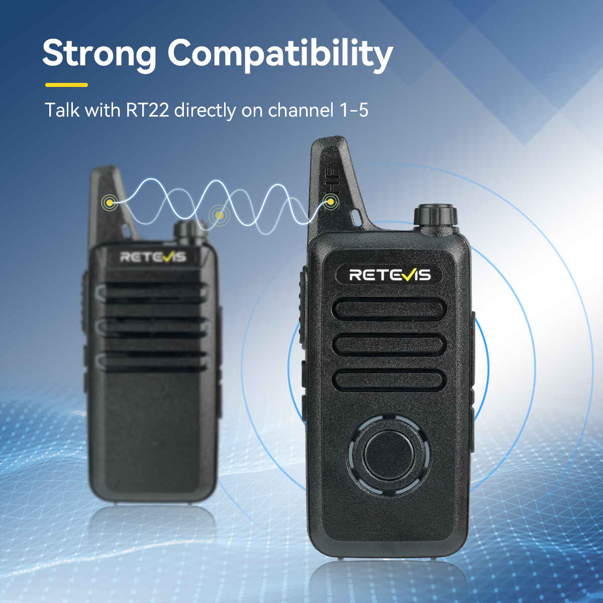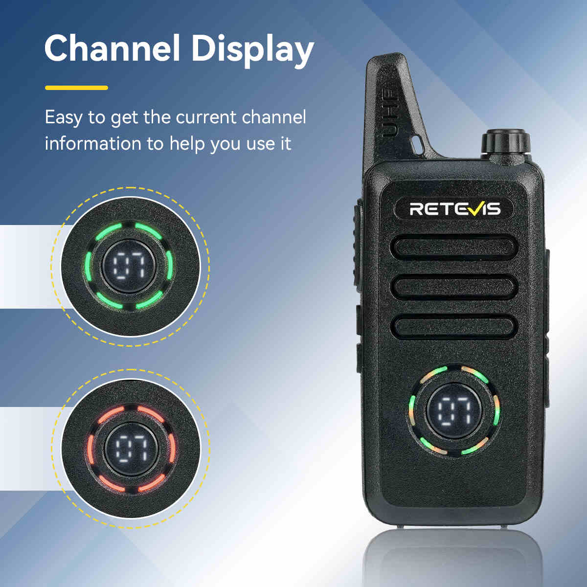 Retevis RT22S license-free FRS walkie talkie features a lightweight and compact design that fits well in your palm and is easy to carry or put in your pocket. It has cycle channel display and signal prompt; you can clearly see the current channel, making it easy to operate and use. It can be widely used in hospitals, churches, healthcare, restaurants, schools, retail stores, family trips and more.