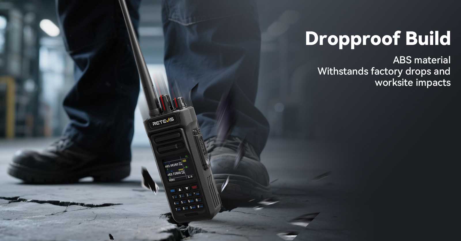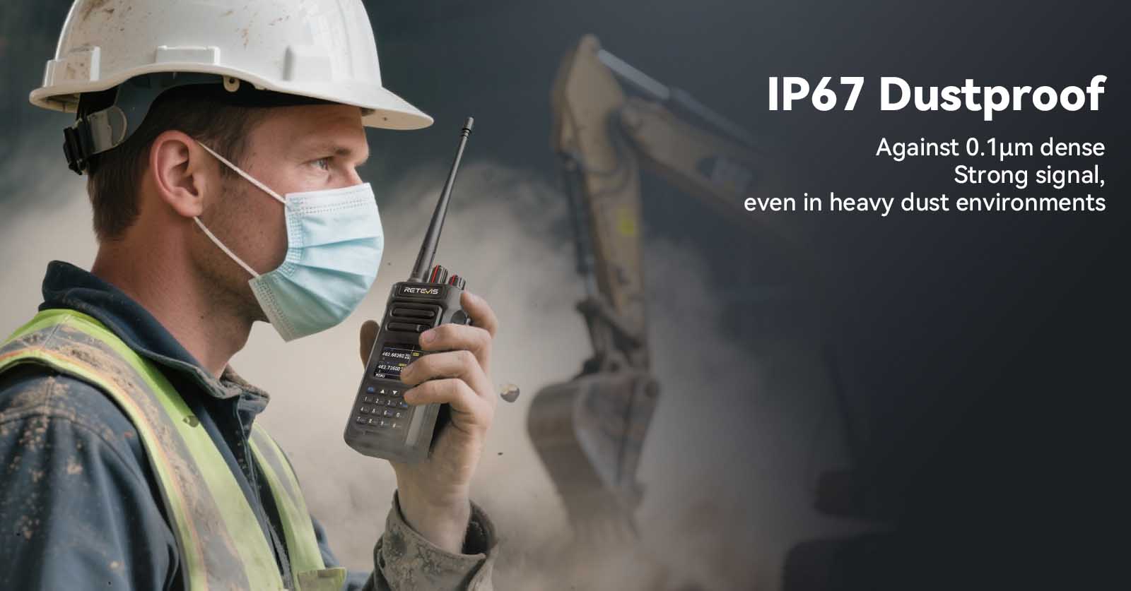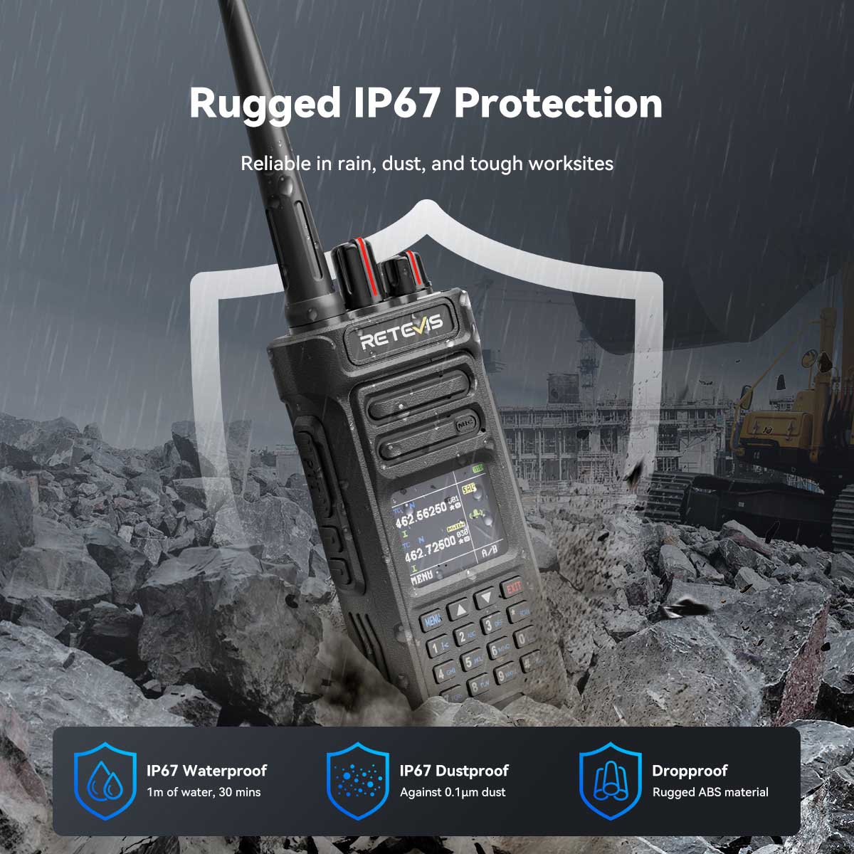 RT29S walkie talkie features IP67 dustproof, waterproof, and dropproof design, ensuring reliable communication in harsh conditions. Built with ABS housing, it withstands rain, mud, and accidental drops, making it perfect for outdoor and industrial environments.