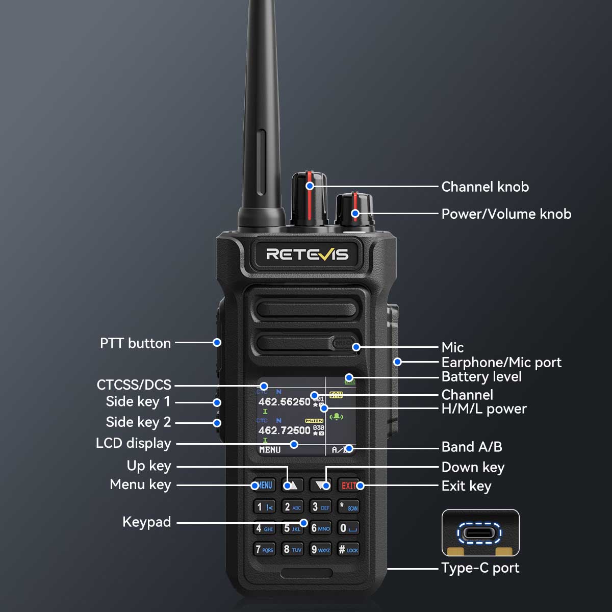 Retevis RT29S two way radio features a 1.77-inch LCD screen and full keypad for easy operation. Quickly view channels and battery status, and switch bands effortlessly for seamless, reliable team communication.