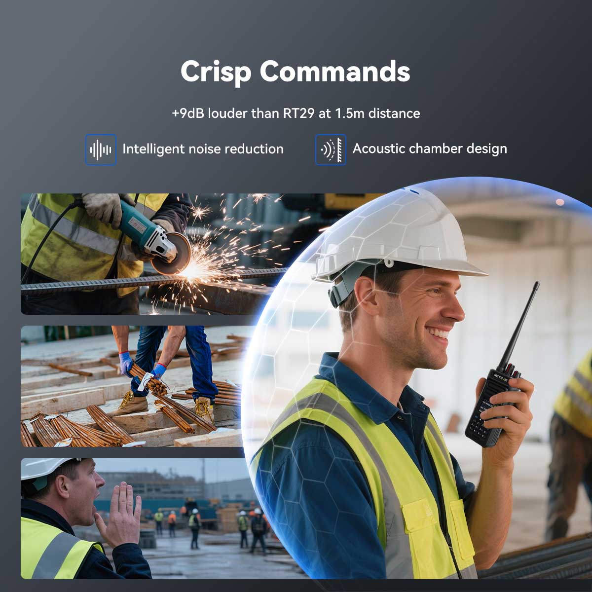 Retevis RT29S ensures crystal-clear audio with advanced noise reduction and optimized acoustic design. Boosting volume by +9dB, it delivers sharp, understandable voice instructions, even in noisy environments like construction sites or factory floors.