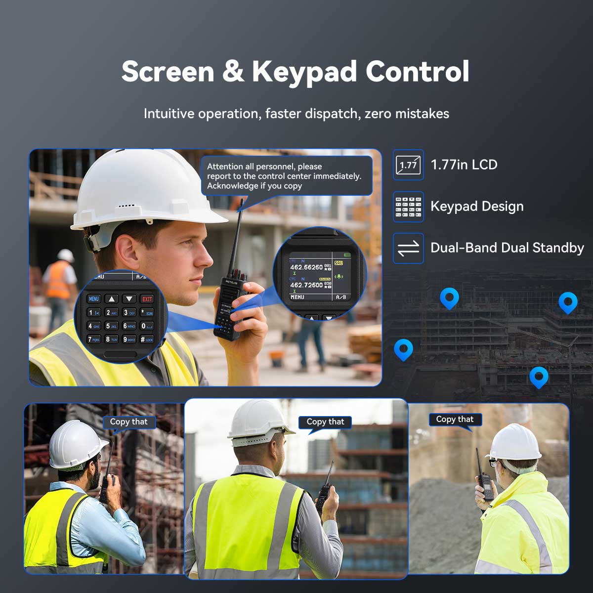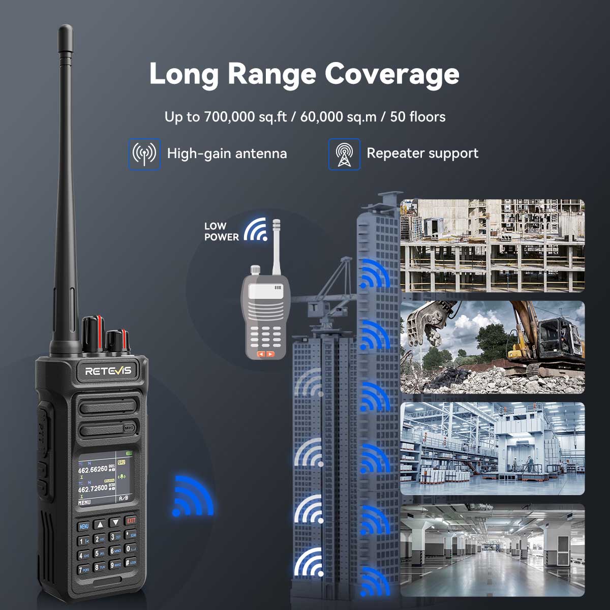 Retevis RT29S long range radio delivers clear communication across up to 700,000 sq.ft (60,000 sq.m) or 50 floors. With high-gain antenna, dual-band flexibility, and repeater support, it ensures stable, long-distance connections for teams in large buildings or wide-area worksites.