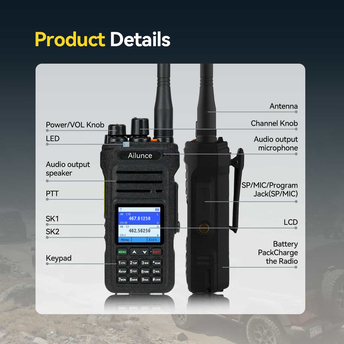 Ailunce HA1G GMRS handheld two-way radio features a 1.77-inch color screen, which provides convenience for checking the current working channel and battery condition during outdoor activities.