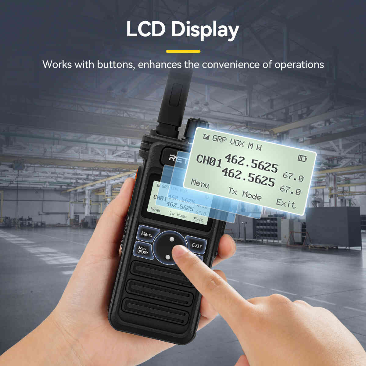 Retevis RT86S GMRS radio has added LCD display and buttons. It has added one-button reset, NOAA weather alarm, Type-C charging and other functions. It further meets the needs of commercial users for simple operation. This 4-pack is perfect for groups and small business teams.