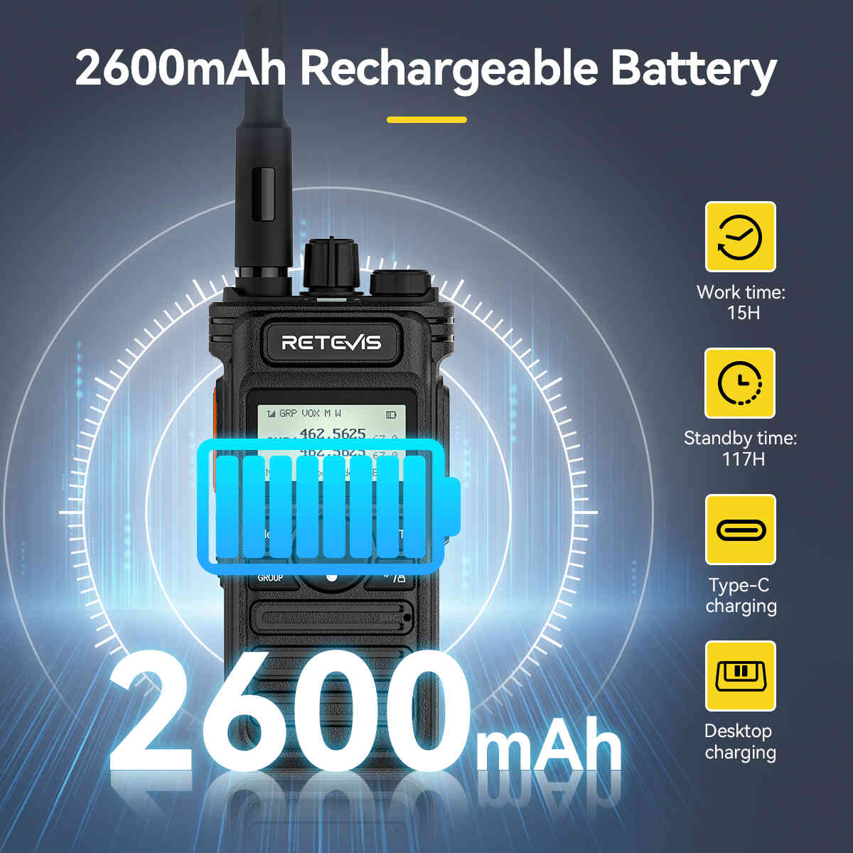 The walkie-talkie with Type-c charging is equipped with a 2600mAh lithium-ion battery. It provides up to 15 hours of use time and 117 hours of standby time. While meeting the needs of long-term work, it can achieve faster and simpler charging.