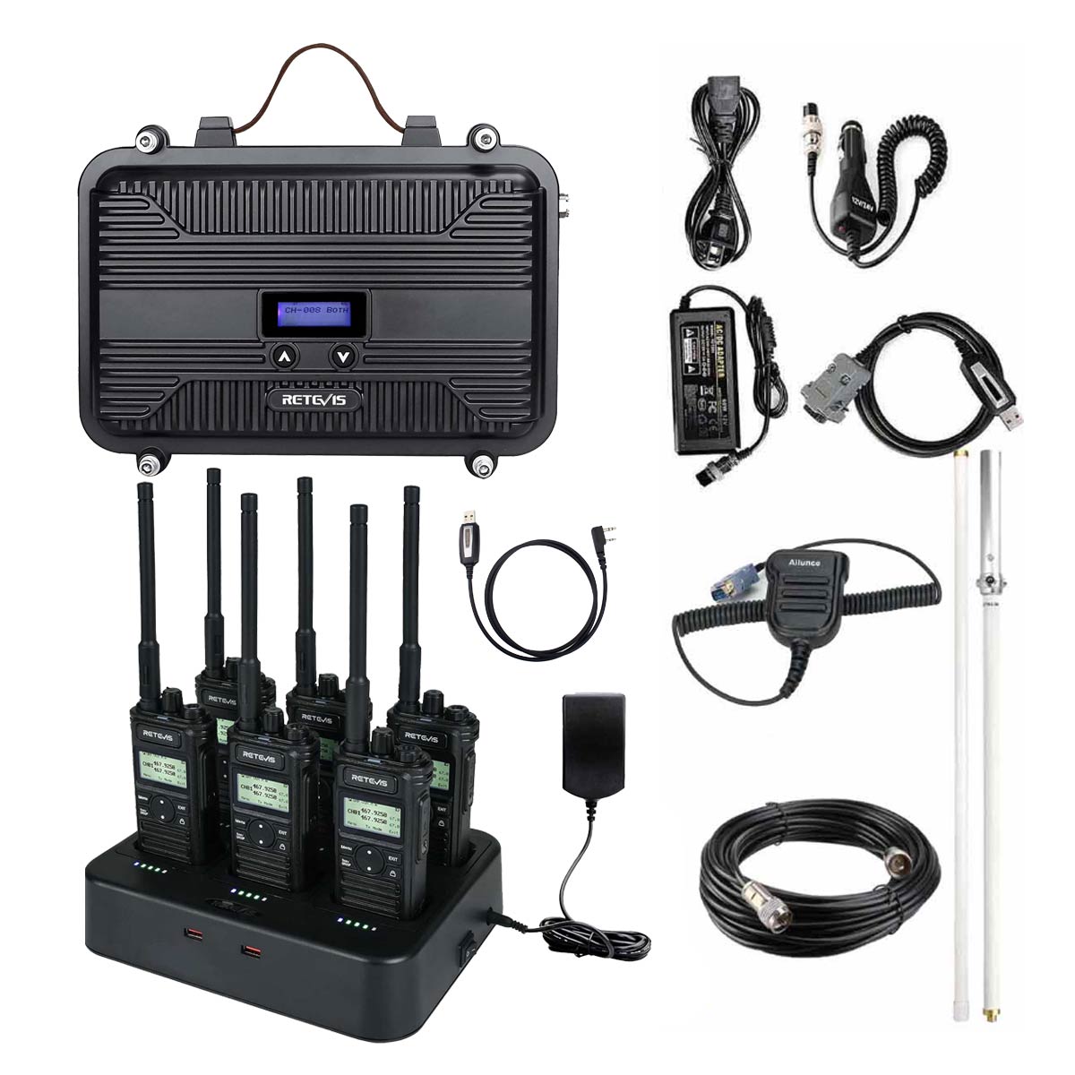 The RT97S repeater in this kit is equipped with a microphone. It can be used to talk directly to walkie-talkies or car radios. This kit comes with 6 RT86S GMRS long range radios to increase the number of users and enable teamwork.