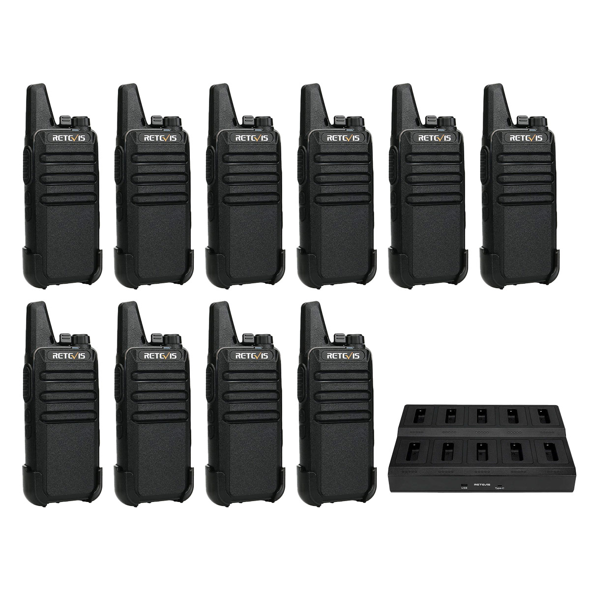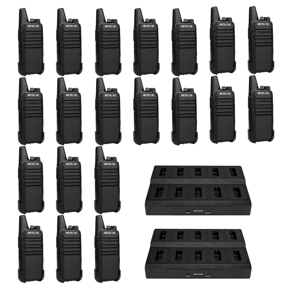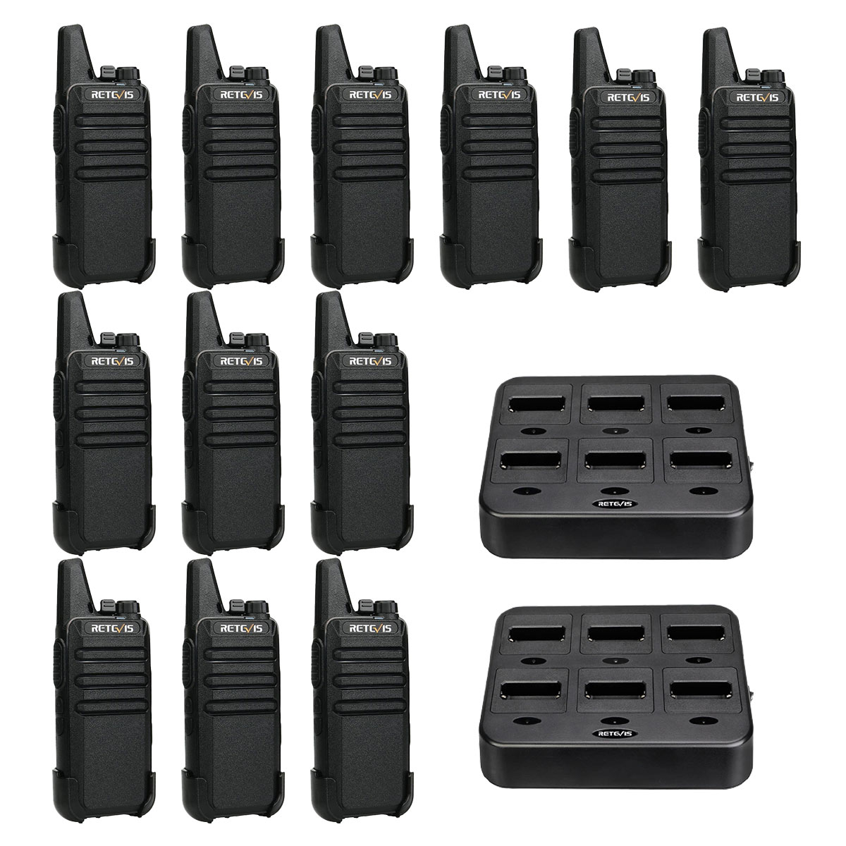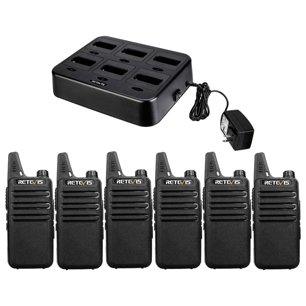I bought 2 dozen of these walkie talkies in total to use for staff and volunteer communication at summer camp, and they work very well! They had a charging station to plug in 6 walkie talkies simultaneously, instead of needing a separate charger for each. But for the price, I got exactly what I wanted and expected.