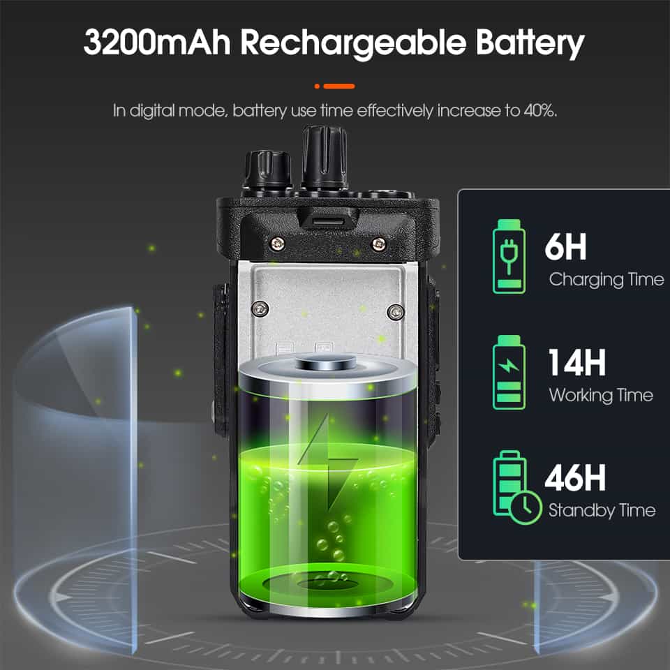 A radio dying at a critical moment can halt dispatches and disrupt workflows. All-Day battery for demanding shift work.The RT29D's high-capacity 3200mAh Li-ion battery supports over 25 hours of continuous talk time, easily powering through a full shift, while its intelligent power-saving design provides up to 46 hours of standby, eliminating power anxiety.