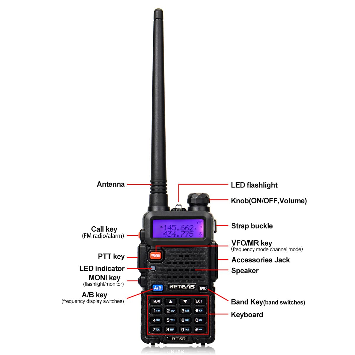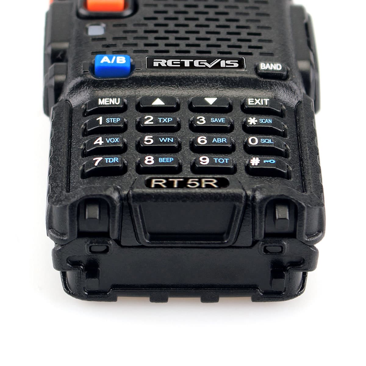 Retevis RT5R 2 way radio has a U&V frequency band, the frequency range: 144-148MHz & 420-450MHz, almost all the functions can be realized by the walkie talkie keypad manu, you can program it by yourself without software or cable.