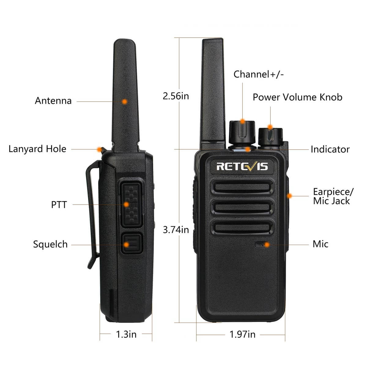 Retevis RT68 license-free two-way walkie-talkie, with a stylish appearance, a comfortable feel, a sturdy shell, wear-resistant, and not easy to scratch. One meter of free fall, no damage to the two-way radio casing, the radio can continue to work. The power/volume adjustment knob has a protective device on the outside. It protects the knob when the walkie talkie is dropped. This radio is suitable for warehouses, docks, construction sites, tourism, hotels, logistics, factories, etc.